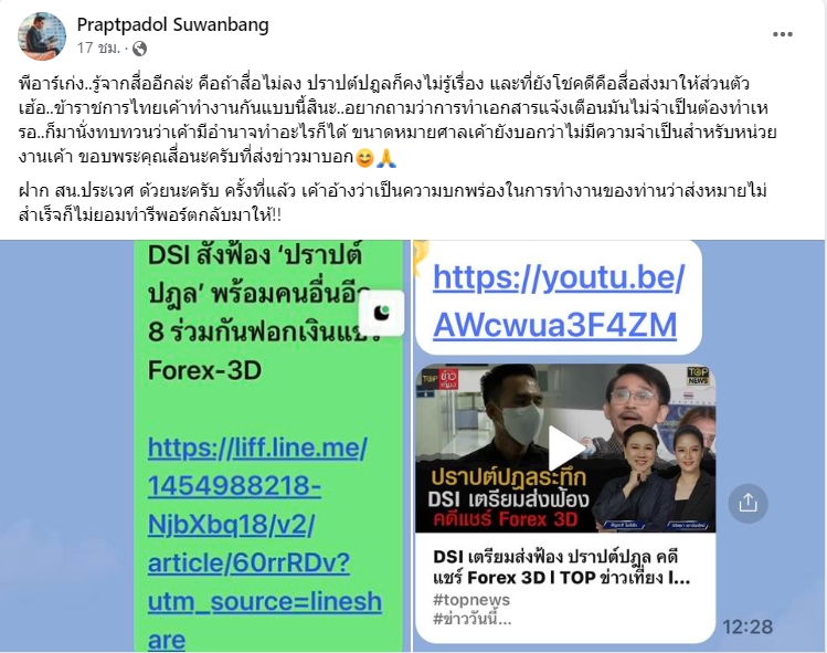 “ปราปต์ปฎล” เคลื่อนไหว หลัง “ดีเอสไอ” สั่งฟ้องข้อหาร่วมกันฟอกเงิน คดี Forex-3D