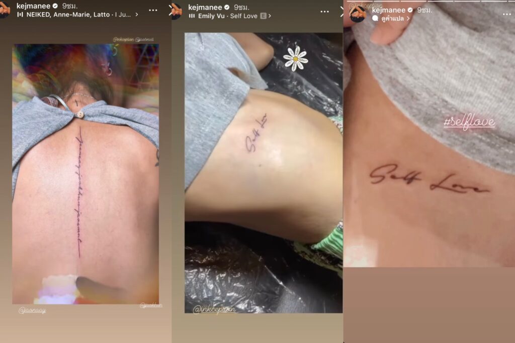 ซึ่ง “ปิ่น เก็จมณี” มีการเคลื่อนไหวในอินสตาแกรมสตอรี่ เป็นคลิปสั้นๆขณะที่เธอกำลังสักที่แผ่นหลัง และช่วงเอว ที่เป็นคำว่า “self love” ที่แปลว่า “รักตัวเอง” นั่นเอง