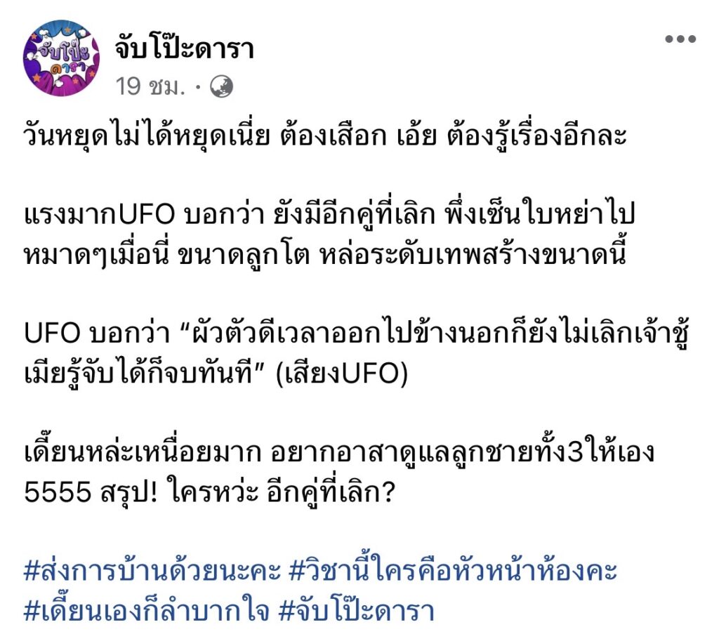 ตอกย้ำด้วยเพจดังอย่าง “จับโป๊ะดารา” ที่ออกมาเคลื่อนไหวใบ้เพิ่มปมข่าวรน้อนนี้อีกว่า “วันหยุดไม่ได้หยุดเนี่ย ต้องเสือก เอ้ย ต้องรู้เรื่องอีกละ แรงมากUFO บอกว่า ยังมีอีกคู่ที่เลิก เพิ่งเซ็นใบหย่าไปหมาดๆเมื่อนี่ ขนาดลูกโต หล่อระดับเทพสร้างขนาดนี้ UFO บอกว่า “ผัวตัวดีเวลาออกไปข้างนอกก็ยังไม่เลิกเจ้าชู้ เมียรู้จับได้ก็จบทันที” (เสียงUFO) เดี๊ยนหล่ะเหนื่อยมาก อยากอาสาดูแลลูกชายทั้ง3ให้เอง 5555 สรุป! ใครหว่ะ อีกคู่ที่เลิก?”