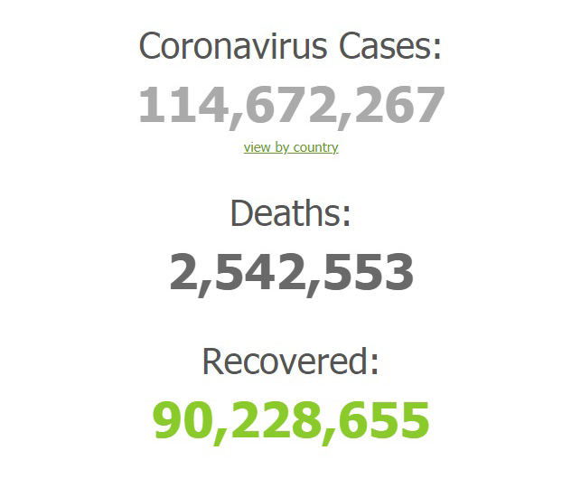 ทั่วโลก ป่วยโควิด-19 แล้วกว่า 114.6 ล้านราย เสียชีวิตกว่า 2.5 ล้าน – สหรัฐอเมริกาหนักครองอันดับ 1 ใกล้ 30 ล้าน มาเลเซียสะสมเกิน 3 แสน