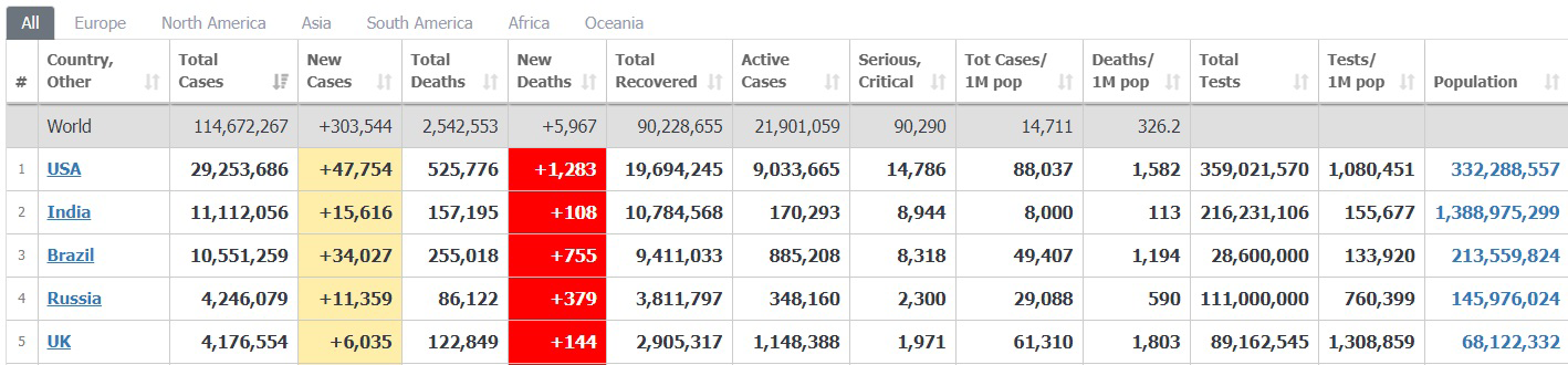 เว็บไซต์ Worldometers รายงานสถานการณ์โควิด-19 ประจำวันที่ 1 มีนาคม 2564 ช่วงเวลาประมาณ 08.10 น. ตามเวลาปะเทศไทย พบผู้ติดเชื้อ ทั่วโลก แล้ว 114,672,267 ราย เพิ่มขึ้น 303,544 ราย เสียชีวิต 2,542,553 ราย เพิ่มขึ้น 5,967 ราย รักษาหาย 90,228,655 ราย