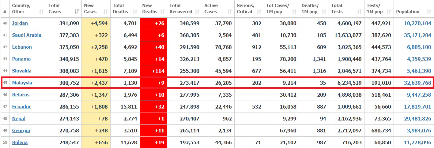 ขณะที่ประเทศมาเลเซีย อยู่ในอันดับที่ 45 มีผู้ติดเชื้อ 300,752 ราย เพิ่มขึ้น 2,437 ราย เสียชีวิต 1,130 ราย เพิ่มขึ้น 9 ราย รักษาหาย 273,417 ราย