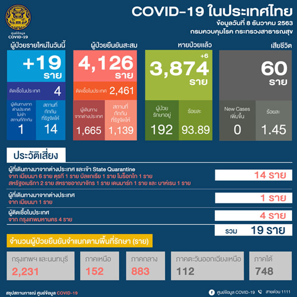 ศูนย์บริหารสถานการณ์โควิด-19 หรือ ศบค. สถานการณ์ โควิด 19 ประจำวันที่ 8 ธ.ค. 2563 ว่า ปัจจุบันประเทศไทยอยู่อันดับที่ 151 ของโลก พบผู้ป่วยใหม่ 19 ราย ยืนยันผู้ป่วยสะสม 4,126 คน รักษาหายกลับบ้านแล้ว 3,874 คน รักษาอยู่ 192 คน และเสียชีวิตรวม 60 คน