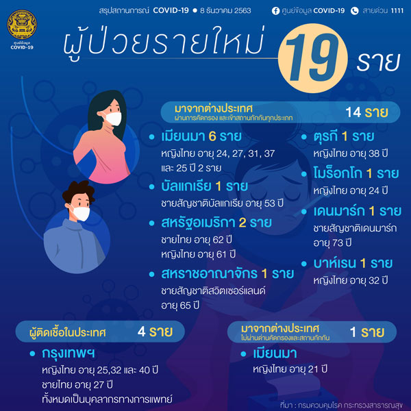 โดยผู้ป่วยรายใหม่เดินทางมาจากประเทศเมียนมา 6 ราย เป็นผู้ป่วยหญิงไทย อายุ 24 ปี ,ผู้ป่วยหญิงไทยอายุ 25 ปี อาชีพพนักงานในสถานบันเทิง เดินทางมาถึงประเทศไทยเมื่อวันที่ 2 ธ.ค.63 และเป็นผู้ป่วยหญิงไทย อายุ 25 ปี ผู้หญิงไทย อายุ 27 ปี ผู้ป่วยหญิงไทยอายุ 37 ปี 2 คน อาชีพพนักงานในสถานบันเทิง ทั้งหมดเดินทางมาถึงประเทศไทยเมื่อวันที่ 5 ธ.ค.63 เดินทางมาจากประเทศตุรกี 1 ราย เป็นผู้ป่วยหญิงไทยอายุ 38 ปี อาชีพธุรกิจส่วนตัว เดินทางมาถึงประเทศไทยเมื่อวันที่ 23 พ.ย.63 เดินทางมาจากประเทศบัลแกเรีย 1 ราย เป็นผู้ป่วยชายสัญชาติบัลแกเรีย อายุ 53 ปี อาชีพนักธุรกิจ เดินทางมาถึงประเทศไทยเมื่อวันที่ 27 พ.ย. 63 ต่อเครื่องบินที่ประเทศตุรกี เดินทางมาจากประเทศโมร็อกโก 1 ราย เป็นผู้ป่วยหญิงไทย อายุ 24 ปี เป็นนักศึกษา เดินทางมาถึงประเทศไทยเมื่อวันที่ 1 ธ.ค.63 เดินทางมาจากประเทศสหรัฐอเมริกา 2 ราย เป็นผู้ป่วยชายไทย อายุ 62 ปี และผู้ป่วยหญิงไทย อายุ 61 ปี ว่างงาน เดินทางมาถึงประเทศไทยเมื่อวันที่ 2 ธ.ค.63 ซึ่งพบผู้ติดเชื้อยืนยันเที่ยวบินเดียวกัน 1 ราย เดินทางมาจากประเทศสหราชอาณาจักร 1 ราย เป็นผู้ป่วยชายสัญชาติ สวิตเซอร์แลนด์ อายุ 65 ปี เป็นนักท่องเที่ยว เดินทางมาถึงประเทศไทยเมื่อวันที่ 2 ธ.ค. 63 ต่อเครื่องบินที่ประเทศสหรัฐอาหรับเอมิเรตส์ เดินทางมาจากประเทศเดนมาร์ก 1 ราย เป็นผู้ป่วยชายสัญชาติเดนมาร์ก อายุ 73 ปี เป็นนักท่องเที่ยว เดินทางมาถึงประเทศไทยเมื่อวันที่ 2 ธ.ค.63 ต่อเครื่องบินที่ประเทศสหรัฐอาหรับเอมิเรตส์ ผู้ที่เคยมีประวัติติดเชื้อโควิด-19 เดินทางมาจากประเทศบาร์เรน 1 ราย เป็นผู้ป่วยหญิงไทย อายุ 32 ปี เป็นผู้ต้องขังมีประวัติติดเชื้อโควิด-19 เมื่อวันที่ 23 พ.ย.63 ผู้เดินทางมาจากต่างประเทศเดินทางมาจากประเทศเมียนมา 1 ราย เป็นผู้ป่วยหญิงไทย อายุ 21 ปี เป็นแม่บ้าน เดินทางมาถึงประเทศไทยเมื่อวันที่ 29 พ.ย. 63 เข้าประเทศไทยตามเส้นทางธรรมชาติ และผู้ติดเชื้อในประเทศ 4 ราย เป็นผู้ป่วยหญิงไทย อายุ 40 ปี อาชีพบุคลากรทางการแพทย์ ปฏิบัติงานใน Alternative State Quarantine เป็นผู้ป่วยหญิงไทย อายุ 32 ปี อาชีพบุคลากรทางการแพทย์ ปฏิบัติงานใน Alternative State Quarantine เป็นผู้ป่วยหญิงไทย อายุ 25 ปี อาชีพบุคลากรทางการแพทย์ และผู้ป่วยชายไทย อายุ 27 ปี อาชีพบุคลากรทางการแพทย์ ปฏิบัติงานที่โรงพยาบาลเอกชน และ Alternative State Quarantine ด้านสถานการณ์โควิด-19 ทั่วโลก พบผู้ป่วยติดเชื้อรวม 67,934,939 คน อาการรุนแรง 106,184 คน รักษาหายแล้ว 47,007,284 คน และเสียชีวิตรวม 1,550,169 คน