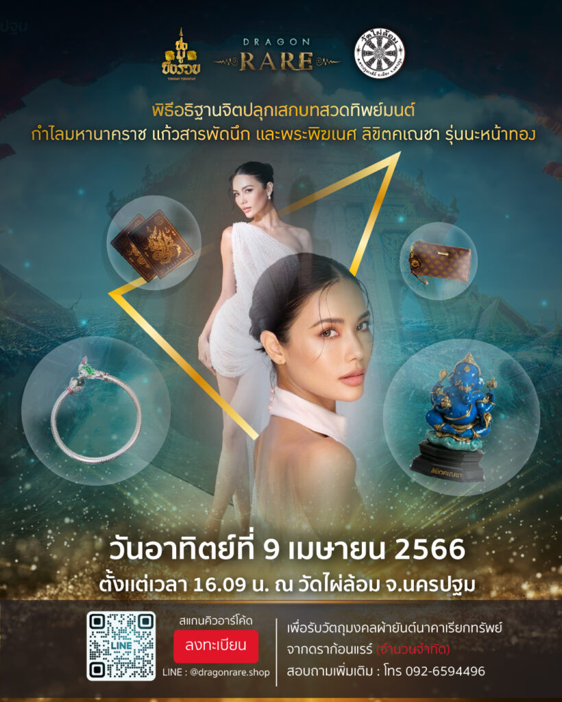 สำหรับผู้ที่สนใจจองพระพิฆเนศ ลิขิตคเณชา รุ่น นะหน้าทอง องค์ปฐมฤกษ์ และสินค้าสายมูอื่นๆ อาทิ แผ่นยันต์นาค, กำไลมหานาคราช แก้วสารพัดนึก และ กระเป๋าเพิ่มพูนทรัพย์ ฯลฯ สามารถสั่งจอง และลงทะเบียนเข้าร่วมงานได้ที่ Line : @dragonrare.shop ตั้งแต่วันนี้ – วันที่ 8 เมษายน 2566 หรือคลิก https://liff.line.me/1645278921-kWRPP32q/?accountId=dragonrare.shop ซึ่งผู้ที่ทำการจองจะได้รับสินค้าที่ผ่านการอธิฐานจิตปลุกเสก โดยหลวงพี่น้ำฝน เจ้าอาวาสวัดไผ่ล้อม หลังจบพิธีทันที นอกจากนี้ยังแจกฟรี ผ้ายันต์นาคา สำหรับผู้ที่ลงทะเบียนเข้าร่วมงานผ่าน Line : @dragonrare.shop เท่านั้น งานจัดขึ้นในวันอาทิตย์ที่ 9 เมษายน 2566 ตั้งแต่เวลา 16.09 น. เป็นต้นไป ณ วัดไผ่ล้อม จ.นครปฐม
