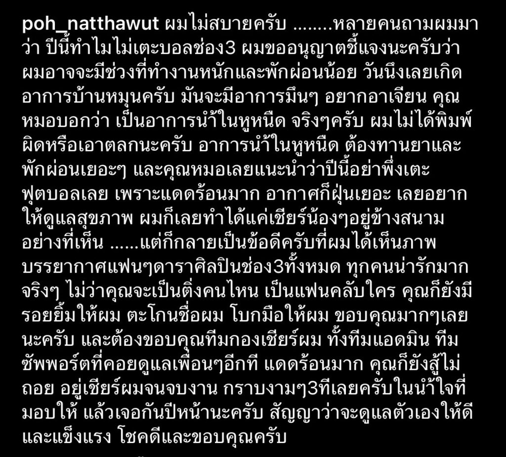 โดยเจ้าตัวได้ชี้แจงว่า “ผมไม่สบายครับ ……..หลายคนถามผมมาว่า ปีนี้ทำไมไม่เตะบอลช่อง3 ผมขออนุญาตชี้แจงนะครับว่า ผมอาจจะมีช่วงที่ทำงานหนักและพักผ่อนน้อย วันนึงเลยเกิดอาการบ้านหมุนครับ มันจะมีอาการมึนๆ อยากอาเจียน คุณหมอบอกว่า เป็นอาการน้ำในหูหนืด จริงๆครับ ผมไม่ได้พิมพ์ผิดหรือเอาตลกนะครับ อาการน้ำในหูหนืด ต้องทานยาและพักผ่อนเยอะๆ”