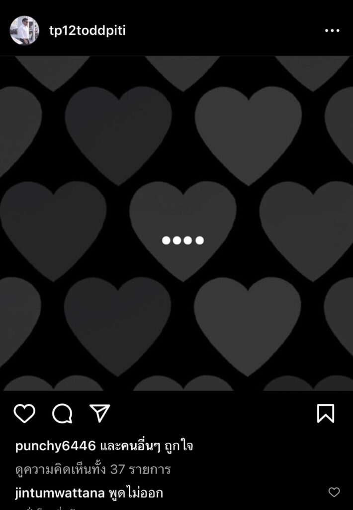 โดยก่อนหน้านี้ทาง “ต๊อด ปิติ” โพสต์ภาพหัวใจสีเทาดำ ซึ่ง “จิน” ได้เข้าไปคอมเมนต์ว่า “พูดไม่ออก”