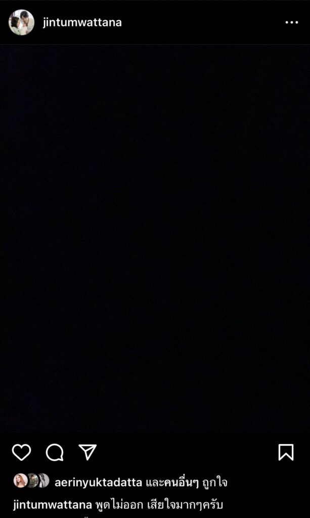 ขณะที่ “จิน ธรรมวัฒนะ” ก็โพสต์ขึ้นจอดำ พร้อมแคปชั่นว่า “พูดไม่ออก เสียใจมากๆครับ”