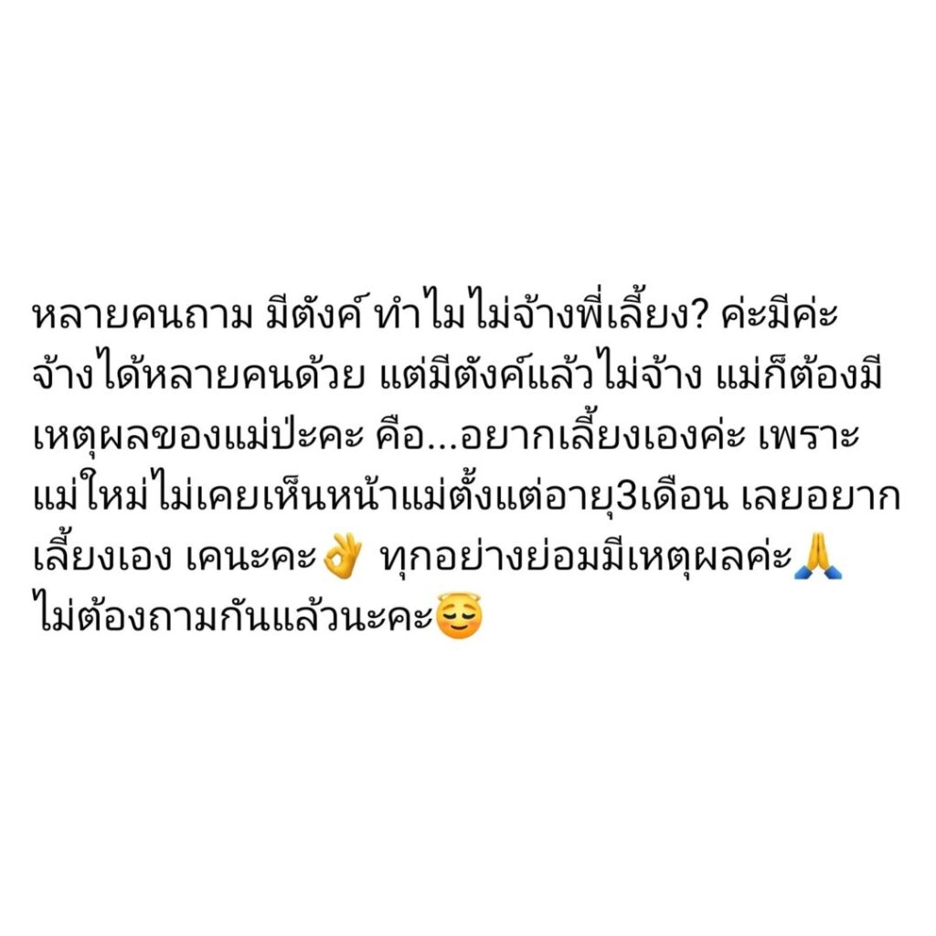 งานนี้เจ้าตัว ตอบชาวเน็ตให้หายสงสัยแบบทีเดียวจบ และให้เหตุผลที่อ่านแล้ว อึ้ง! ว่า “หลายคนถาม มีตังค์ ทำไมไม่จ้างพี่เลี้ยง? ค่ะมีค่ะ จ้างได้หลายคนด้วย แต่มีตังค์แล้วไม่จ้าง แม่ก็ต้องมีเหตุผลของแม่ป่ะคะ คือ…อยากเลี้ยงเองค่ะ เพราะแม่ใหม่ไม่เคยเห็นหน้าแม่ตั้งแต่อายุ 3 เดือน เลยอยากเลี้ยงเอง เคนะคะ ทุกอย่างย่อมมีเหตุผลค่ะ ไม่ต้องถามกันแล้วนะคะ”