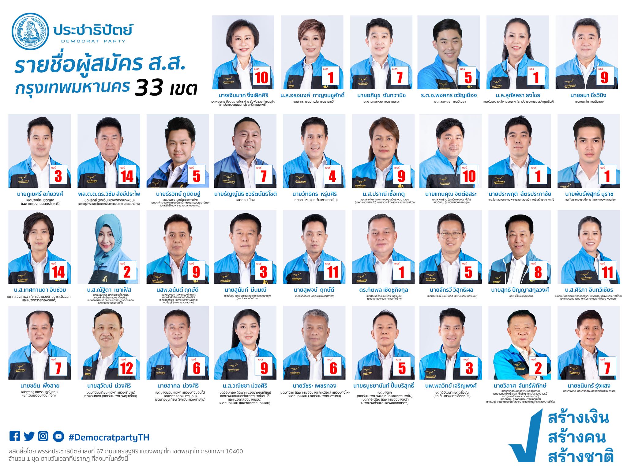 เปิดหมายเลขผู้สมัคร ส.ส.กทม.พรรคประชาธิปัตย์ ทั้ง 33 เขตเลือกตั้ง