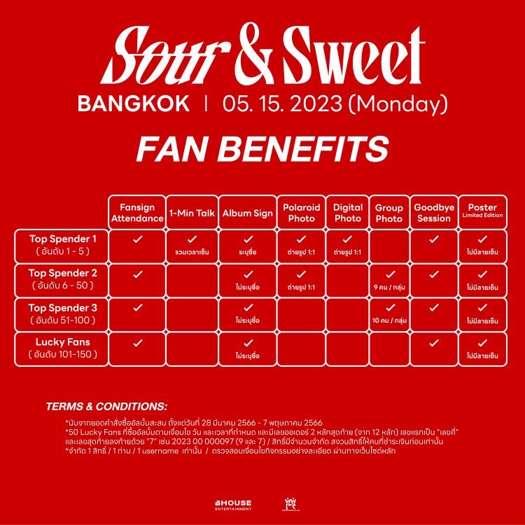การกลับมาครั้งนี้ แบมแบมเองก็ยังมีเซอร์ไพรส์ให้กับแฟนๆ ที่ซื้ออัลบั้มทั้งเวอร์ชั่น “Sour” และ “Sweet” ได้มีโอกาสใกล้ชิด สนุกสนาน และฟินแบบขีดสุด กับการร่วมกิจกรรม เพื่อรับสิทธิ์เข้าร่วมงานแฟนไซน์ “BamBam Sour & Sweet Album Fansign in Thailand 2023” ที่จะจัดขึ้นในวันที่ 15 พฤษภาคม 2566 นี้ โดยสามารถสั่งซื้อ Sour & Sweet Album ได้แล้ววันนี้ ผ่านทางเว็บไซต์ www.bambamfansign2023.com