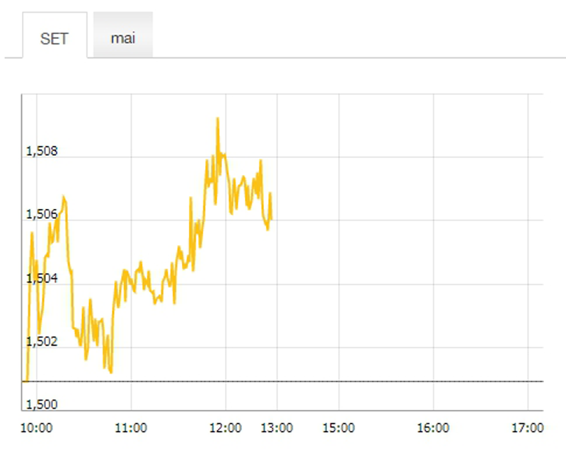 ปิดตลาดหุ้นไทยเช้าเพิ่มขึ้น 5.14 จุด แตะ 1,506.06 จุด มูลค่าซื้อขาย 48,573.50 ล้านบาท ขณะแลกเปลี่ยนล่าสุดขายออก 30.12 บาท