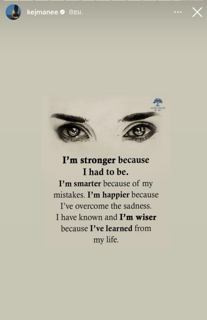 ขณะที่ในไอจีสตอรีที่เจ้าตัวโพสต์ภาษาอังกฤษแปลได้ว่า “ฉันแข็งแกร่งขึ้นเพราะฉันต้องเป็น ฉันฉลาดขึ้นเพราะความผิดพลาดของตัวเอง ฉันมีความสุขขึ้นเพราะฉันเอาชนะความเศร้า ฉันรู้และฉันฉลาดขึ้นเพราะฉันได้เรียนรู้จากชีวิตของตัวเอง”