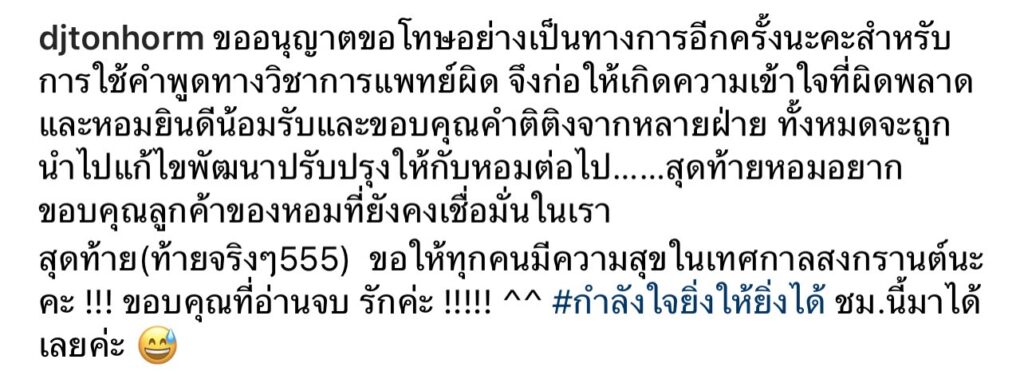 ล่าสุดทางด้านสาวต้นหอม หวั่นคนเข้าใจผิด รีบออกมาชี้แจงว่า “ขออนุญาตขอโทษอย่างเป็นทางการอีกครั้งนะคะสำหรับการใช้คำพูดทางวิชาการแพทย์ผิด จึงก่อให้เกิดความเข้าใจที่ผิดพลาด และหอมยินดีน้อมรับและขอบคุณคำติติงจากหลายฝ่าย ทั้งหมดจะถูกนำไปแก้ไขพัฒนาปรับปรุงให้กับหอมต่อไป……สุดท้ายหอมอยากขอบคุณลูกค้าของหอมที่ยังคงเชื่อมั่นในเราสุดท้าย(ท้ายจริงๆ555) ขอให้ทุกคนมีความสุขในเทศกาลสงกรานต์นะคะ !!! ขอบคุณที่อ่านจบ รักค่ะ !!!!! ^^ #กำลังใจยิ่งให้ยิ่งได้ ชม.นี้มาได้เลยค่ะ”