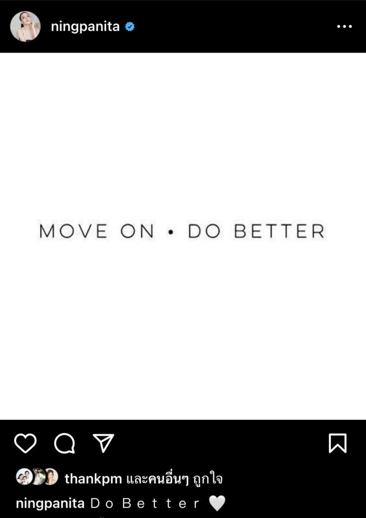 แต่ล่าสุดก็ดูเหมือนว่ามีบางอย่างที่ทำเอาชาวเน็ตาะดุด เมื่อเจ้าตัวโพสต์ข้อความระบุว่า “MOVE ON . DO BETTER” แปลว่า มูฟออน–ทำให้ดีขึ้น พร้อมเขียนแคปชั่นเพียงสั้นๆ ว่า “Do Better”