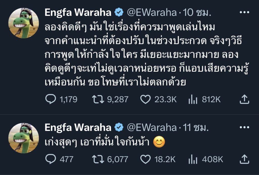 จากนั้นรุ่นพี่อย่าง “อิงฟ้า วราหะ” ก็ได้ทวีตข้อความว่า “ลองคิดดีๆ มันใช่เรื่องที่ควรมาพูดเล่นไหม จากคำแนะนำที่ต้องปรับในช่วงประกวด จริงๆวิธีการพูดให้กำลังใจใคร มีเยอะแยะมากมาย ลองคิดดูดีๆจะเท่ไม่ดูเวลาหน่อยหรอ ก็แอบเสียความรู้เหมือนกัน ขอโทษที่เราไม่ตลกด้วย” และ “เก่งสุดๆ เอาที่มั่นใจกันน้า”