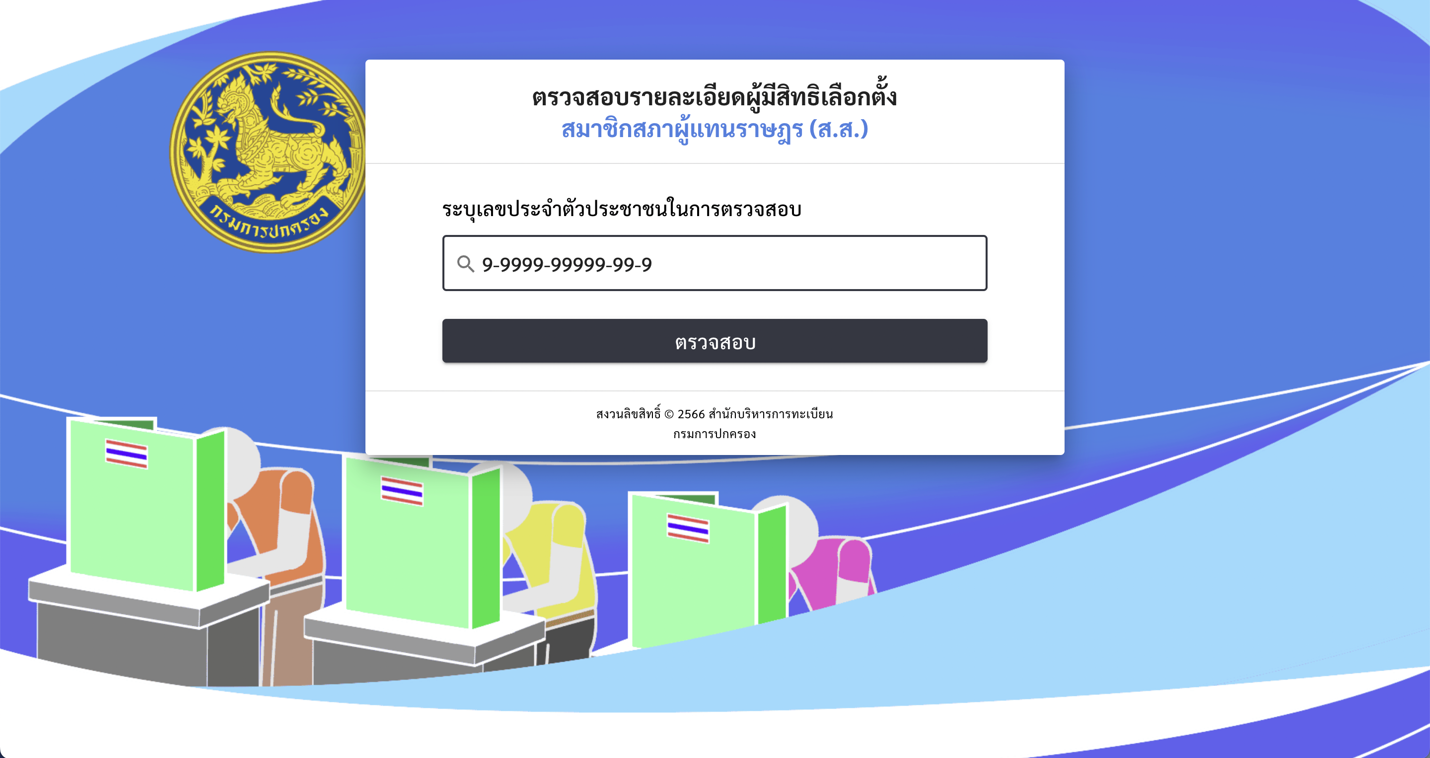 - เข้าไปที่เว็บไซต์ ตรวจสอบรายละเอียดผู้มีสิทธิเลือกตั้งสมาชิกสภาผู้แทนราษฎร