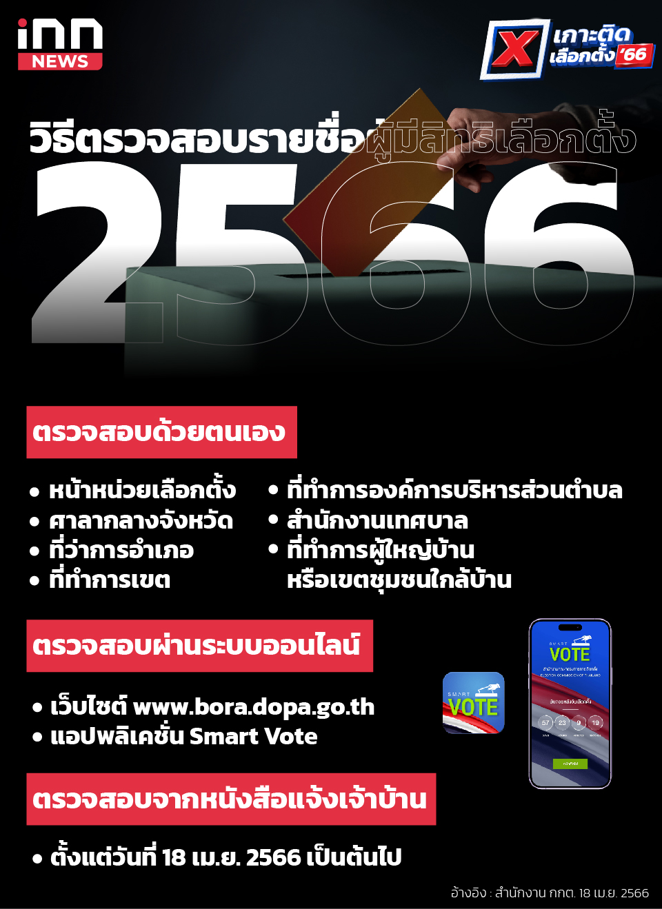 โดยสามารถตรวจสอบรายชื่อผู้มีสิทธิเลือกตั้งผ่านหนังสือแจ้งเจ้าบ้าน (ส.ส.1/6) ตั้งแต่วันที่ 18 เมษายน 2566