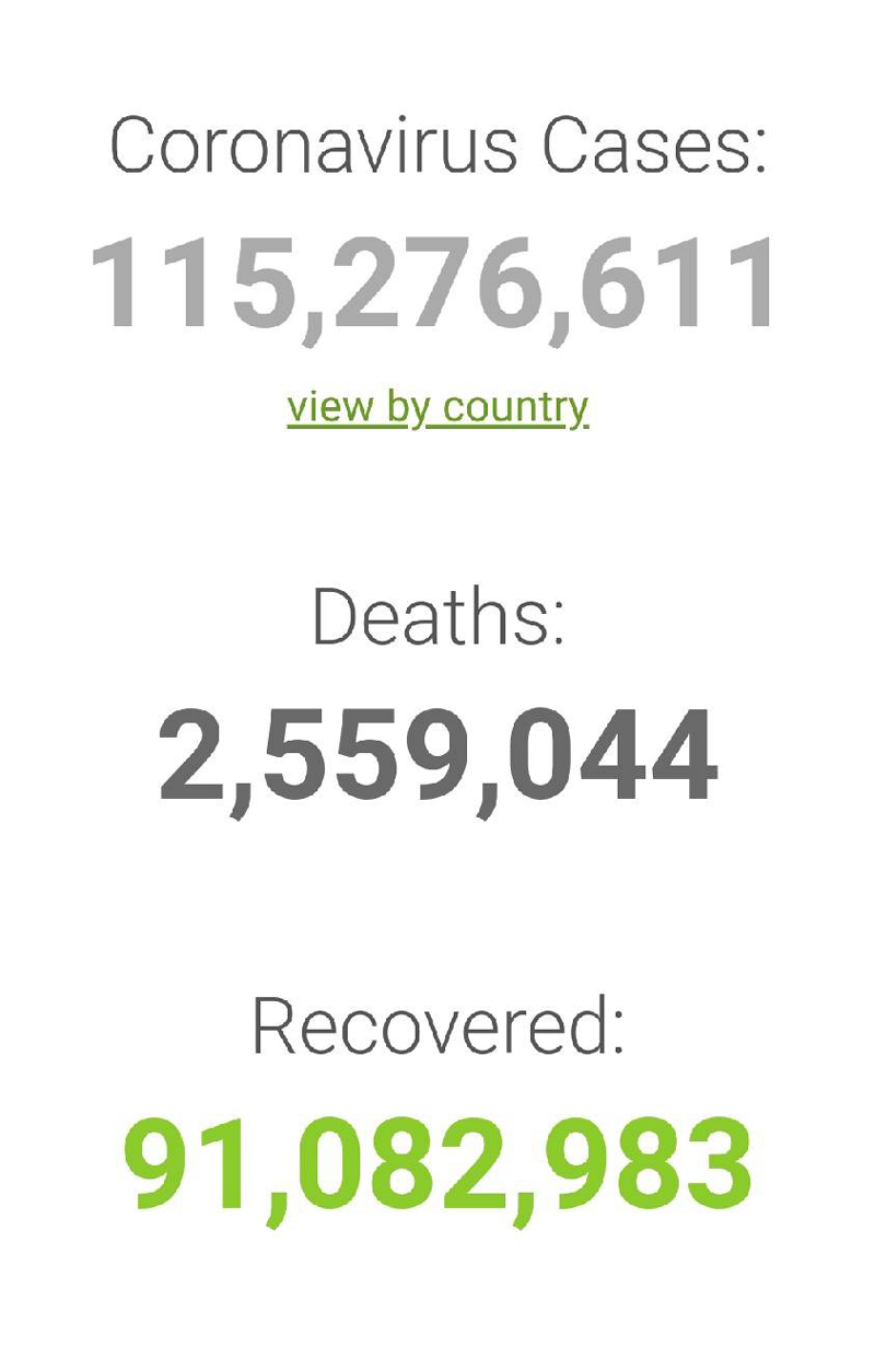 เว็บไซต์ Worldometers รายงานสถานการณ์โควิด-19 ประจำวันที่ 3 มีนาคม 2564 ช่วงเวลาประมาณ 07.40 น. ตามเวลาประเทศไทย พบผู้ติดเชื้อ ทั่วโลก แล้ว 115,276,611 ราย เพิ่มขึ้น 354,602 ราย เสียชีวิต 2,559,044 ราย เพิ่มขึ้น 8,997 ราย รักษาหาย 91,082,983 ราย