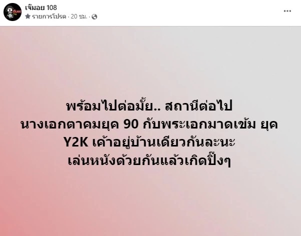 เรียกว่าช่วงนี้ชาวบ้านหนึ่งทำงานหนักยิ่งเซเว่นอีกจร้า เมื่อเพจดังต่างๆมั่งออกมาหย่อนคำไบ้ปริศนาที่ต่างเข้ามาอ่านแล้วต้องร้องเอ๊ะยังไงยังไงกันเป็นประจำ ล่าสุดขอบตาดำกันอีกแล้ว เมื่อเพจเจ๊มอย108 ออกมาเปิดประเด็นโพสต์ข้อความ “พร้อมไปต่อมั้ย..สถานีต่อไปนางเอกตาคมยุค 90 กับ พระเอกมาดเข้ม ยุค Y2K เค้าอยู่บ้านเดียวกันละนะ เล่นหนังด้วยกันแล้วเกิดปิ๊ง”