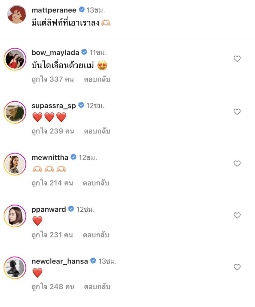 ล่าสุดสาวแมทได้ออกมาเคลื่อนไหวหลังประกาศเลิก โดยโพสต์ภาพตัวเองทำรูปหัวใจ ยิ้มสวยๆ พร้อมแคปชั่นว่า”มีแต่ลิฟท์ที่เอาเราลง” ท่ามกลางคนบันเทิงและชาวเน็ตต่างแห่ส่งกำลังใจให้สาวแมทกันสนั่นไอจี
