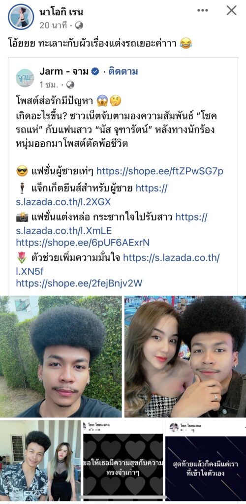 ล่าสุด นัส จุฑารัตน์ ต้องรีบออกมาเคลียร์ก่อนเรื่องบานปลาย โดยระบุข้อความว่า “โอ้ยยย ทะเลาะกับผัวเรื่องแต่งรถเยอะค่า”