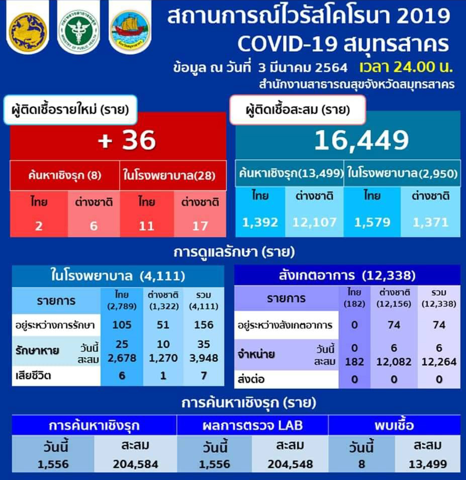 สำนักประชาสัมพันธ์จังหวัดสมุทรสาคร รายงานผู้ติดเชื้อ โควิด-19 ประจำวันที่ 3 มีนาคม 2564 เวลา 24.00 น.พบผู้ติดเชื้อเพิ่มอีก 36 ราย เป็นคนไทย 13 ราย ต่างด้าว23 ราย ค้นหาเชิงรุก 8 ราย  รับการรักษาในโรงพยาบาล 28 ราย รวมสะสม 16,449 ราย รักษาหายดี 16,212 ราย เสียชีวิตสะสมคงที่ 7 ราย เป็นคนไทย 6 ราย ต่างด้าว 1 ราย