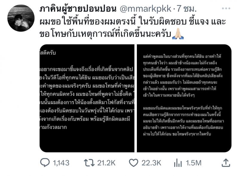 ผมยอมรับผิดและผมขอโทษจริงๆครับที่ทำให้ทุกคนเสียความรู้สึกจากการกระทำของผมในครั้งนี้ผมจะไม่ให้เกิดขึ้นอีกครับ และผมขอโทษที่ออกมาอธิบายช้า เพราะอยากให้งานที่ผมต้องรับผิดชอบผ่านไปให้ได้ก่อน ขอโทษจริงๆจากใจครับ”