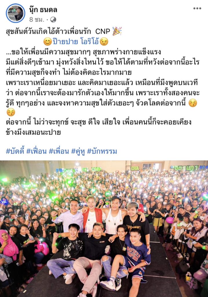 ทำเอาแฟนคลับทั้งฟิน ทั้งยิ้มแก้มแดงกันสนั่น เมื่อนักร้องหนุ่ม”นุ๊ก ธนดล ศิริแวว” ได้ออกมาอวยพรวันเกิดให้คู่จิ้น “ป๊ายปาย โอริโอ้” หรือ “ปาย ฉัตรนภา เขียวขำ” โดยหนุ่ม”นุ๊ก”ได้โพสต์ภาพพร้อมเขียนแคปชั่นว่า “สุขสันต์วันเกิดไอ้ต้าวเพื่อนรัก CNP ป๊ายปาย โอริโอ้…ขอให้เพื่อนมีความสุขมากๆ สุขภาพร่างกายแข็งแรง