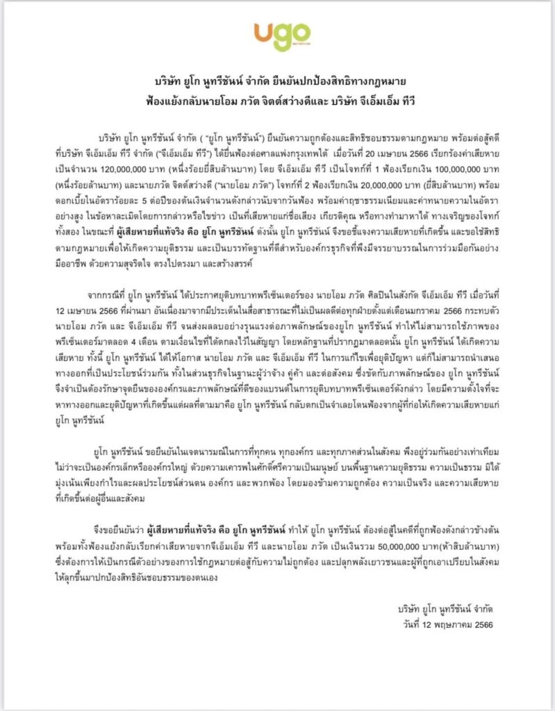 ล่าสุดทางด้านบริษัท UGO Nutrition ได้ออกมาร่อนจดหมายอีกครั้งว่า “บริษัท ยูโก นูทรีชันน์ จำกัด ( “ยูโก นูทรีชันน์”# ยืนยันความถูกต้องและสิทธิชอบธรรมตามกฎหมาย พร้อมต่อสู้คดี ที่บริษัท จีเอ็มเอ็ม ที่วี จำกัด (“จีเอ็มเอ็ม ที่วี” ได้ยื่นฟ้องต่อศาลแพ่งกรุงเทพใต้ เมื่อวันที่ 20 เมษายน 2566 เรียกร้องค่าเสียหายเป็นจำนวน 120,000,000 บาท (หนึ่งร้อยยี่สิบล้านบาท) โดย จีเอ็มเอ็ม ที วี เป็นโจทก็ที่ 1 ฟ้องเรียกเงิน 100,000,000 บาท (หนึ่งร้อยล้านบาท) และนายภวัด จิตต์สว่างดี (“นายโอม ภวัด” โจทก็ที่ 2 ฟ้องเรียกเงิน 20,000,000 บาท (ยี่สิบล้านบาท) พร้อม ดอกเบี้ยในอัตราร้อยละ 5 ต่อปีของต้นเงินจำนวนดังกล่าวนับจากวันฟ้อง พร้อมค่าฤชาธรรมเนียมและค่าทนายความในอัตรา อย่างสูง ในข้อหาละเมิดโดยการกล่าวหรือไขข่าว เป็นที่เสียหายและ ชื่อเสียง เกียรติคุณ หรือทางทำมาหาได้ ทางเจริญของโจทก์ ทั้งสอง ในขณะที่ ผู้เสียหายที่แท้จริง คือ ยูโก นูทรีชันนั ดังนั้น ยูโก นูทรีชันน์ จึงขอชี้แจงความเสียหายที่เกิดขึ้น และขอใช้สิทธิ ตามกฎหมายเพื่อให้เกิดความยุติธรรม และเป็นบรรทัดฐานที่ดีสำหรับองค์กรธุรกิจที่พึงมีจรรยาบรรณในการร่วมมือกันอย่าง มืออาชีพ ด้วยความสุจริตใจ ตรงไปตรงมา และสร้างสรรค์