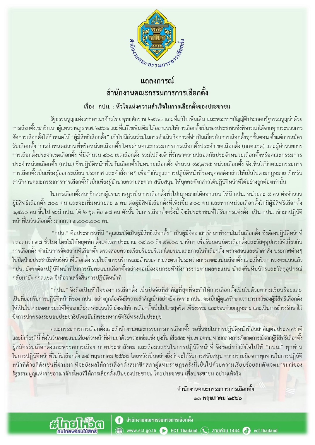 คณะกรรมการการเลือกตั้งและสำนักงานคณะกรรมการการเลือกตั้ง ขอชื่นชมในการปฏิบัติหน้าที่อันสำคัญต่อประเทศชาติและมีเกียรตินี้ ทั้งในวันลงคะแนนเสียงล่วงหน้าที่ผ่านมาด้วยความเข็มแข็ง มุ่งมั่น เสียสละ ทุ่มเท อดทน ท่ามกลางการสังเกตการณ์จากผู้มีสิทธิเลือกตั้ง ผู้สมัครรับเลือกตั้งและพรรคการเมือง ภาคประชาสังคม และสื่อมวลชนในการปฏิบัติหน้าที่ จึงขอส่งกำลังใจไปให้ “กปน.” ทุกท่าน ในการปฏิบัติหน้าที่ในวันเลือกตั้ง 14 พฤษภาคม 2566 โดยหวังเป็นอย่างยิ่งว่าจะได้รับการสนับสนุน ความร่วมมือจากทุกท่านในการปฏิบัติหน้าที่ด้วยดีดังเช่นที่ผ่านมา ที่จะยังผลให้การเลือกตั้งสมาชิกสภาผู้แทนราษฎรครั้งนี้เป็นไปด้วยความเรียบร้อยสมดังเจตนารมณ์ของรัฐธรรมนูญแห่งราชอาณาจักรไทยที่ให้การเลือกตั้งเป็นของประชาชน โดยประชาชน เพื่อประชาชน อย่างแท้จริง
