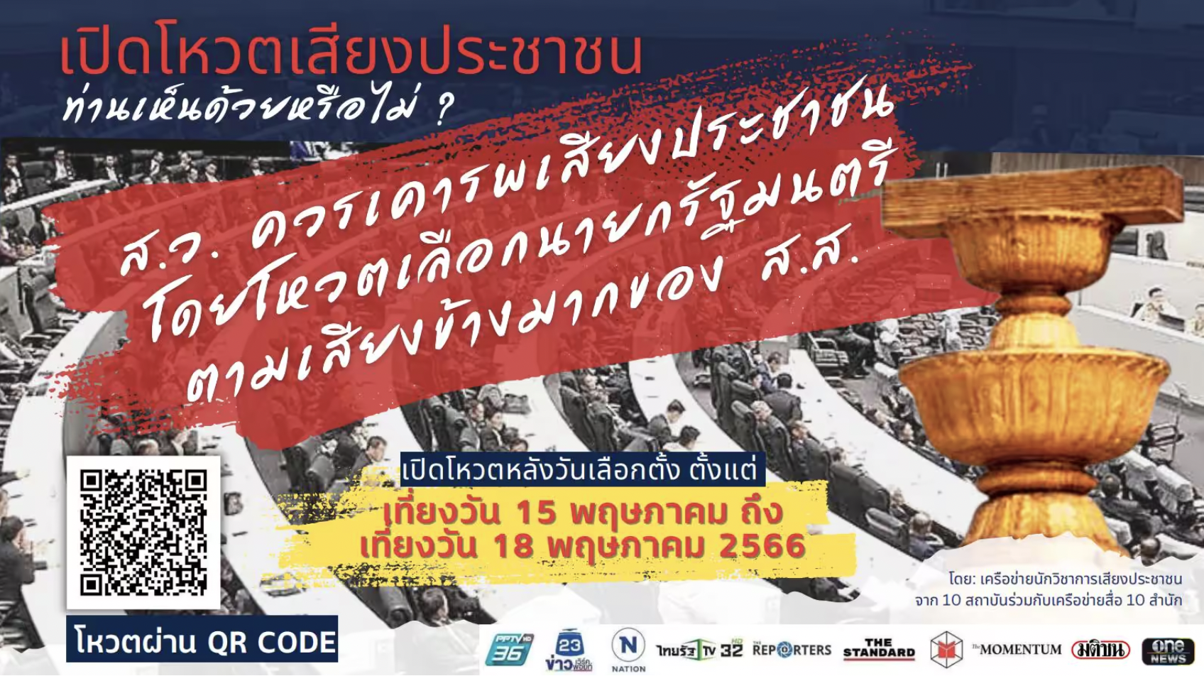 นอกจากนี้ เครือข่ายนักวิชาการเสียงประชาชนจาก 10 สถาบัน ร่วมกับเครือข่ายสื่อ 10 สำนัก ยังได้มีการเปิดโหวตออนไลน์สำรวจความเห็นจากคนกันเองด้วยเหมือนกันว่าเห็นด้วยหรือไม่ที่ ส.ว.ทั้ง 250 คนควรที่จะเคารพเสียงประชาชนโดยต้องโหวตเลือกนายกฯตามเสียงข้างมากของ ส.ส. ?