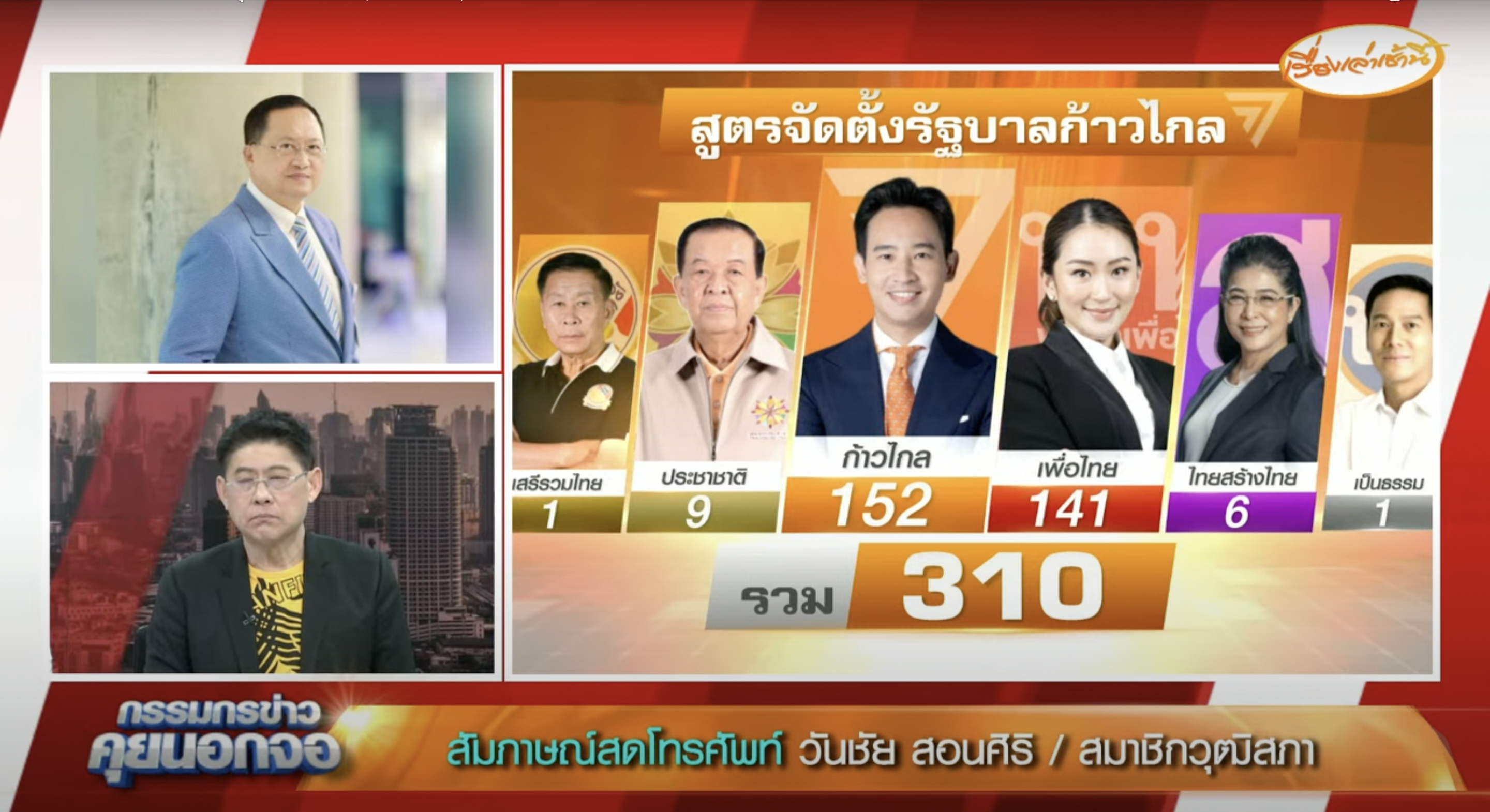 โดยผลการเลือกตั้ง พรรคก้าวไกลคว้าเก้าอี้ ส.ส. ไปทั้งหมด 152 ที่นั่ง, เพื่อไทย 141 ที่นั่ง,