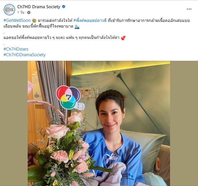 โดยในเพจเฟซบุ๊ก Ch7HD Drama Society ได้โพสต์ภาพนางเอกสาว นั่งอย฿บนเตียงคนไข้ พร้อมระบุข้อความว่า “#GetWellSoon มาร่วมส่งกำลังใจให้ #พิ้งค์พลอยปภาวดี ที่เข้ารับการรักษาอาการกล้ามเนื้อคออักเสบแบบเฉียบพลัน ขณะนี้พักฟื้นอยู่ที่โรงพยาบาล”