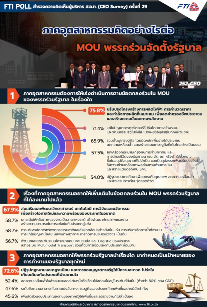 นายมนตรี มหาพฤกษ์พงศ์ รองประธานสภาอุตสาหกรรมแห่งประเทศไทย หรือ ส.อ.ท. เปิดเผยผลการสำรวจ FTI Poll เดือนพฤษภาคม 2566 ภายใต้หัวข้อ “ภาคอุตสาหกรรมคิดอย่างไรต่อ MOU พรรคร่วมจัดตั้งรัฐบาล” พบว่า ผู้บริหาร ส.อ.ท. ส่วนใหญ่ คาดหวังให้รัฐบาลใหม่เร่งดำเนินการในเรื่องการปรับปรุงโครงสร้างการผลิตไฟฟ้า การคำนวณราคา และกำลังการผลิตที่เหมาะสม เพื่อลดค่าครองชีพประชาชนและสร้างความมั่นคงทางพลังงาน ตามที่ระบุใน MOU โดยเร็ว ซึ่งเป็นประเด็นที่ภาคอุตสาหกรรมได้มีการเรียกร้องมาตลอดในช่วงที่ผ่านมา