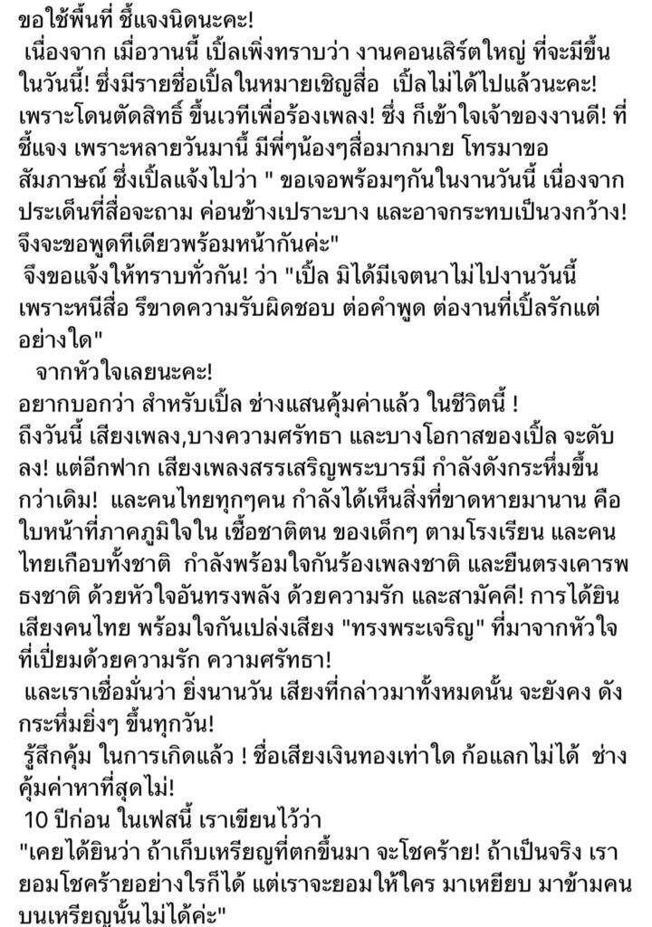 “ขอใช้พื้นที่ ชึ้แจงนิดนะคะ! เนื่องจาก เมื่อวานนี้ เปิ้ลเพิ่งทราบว่า งานคอนเสิร์ตใหญ่ ที่จะมีขึ้น ในวันนี้! ซึ่งมีรายชื่อเปิ้ลในหมายเชิญสื่อ เปิ้ลไม่ได้ไปแล้วนะคะ! เพราะโดนตัดสิทธิ์ ขึ้นเวทีเพื่อร้องเพลง! ซึ่ง ก็เข้าใจเจ้าของงานดี! ที่ชี้แจง เพราะหลายวันมานึ้ มีพี่ๆน้องๆสื่อมากมาย โทรมาขอสัมภาษณ์ ซึ่งเปิ้ลแจ้งไปว่า ” ขอเจอพร้อมๆกันในงานวันนี้ เนื่องจากประเด็นที่สื่อจะถาม ค่อนข้างเปราะบาง และอาจกระทบเป็นวงกว้าง!