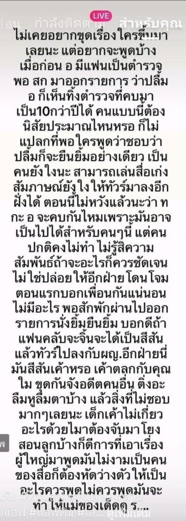 ยังหยิบยกพฤติกรรมเก่า ว่าแต่ก่อนแม่นี้คบกับหมวดอ๋อ แต่พอไปออกรายการตีท้ายครัวเจอสงกรานต์ ก็เลิกกัน ต้องเป็นคนแบบไหน ไม่พอตอนเลิกกันกับสงกรานต์ ก็พยายามโยงว่าใครเป็นมือที่สามจนคนไปถล่มแมท แม่แอฟจะโดนว่าแล้วในฟีดยังพูดถึงน้องปีใหม่ด้วยว่า ชอบเอาเรื่องผู้ใหญ่มาพูด เป็นเด็กแก่… (ฉันว่าคำมันแรงไป)เรื่องมันก็ประมานนี้แหละค่ะคุณขาาาาา