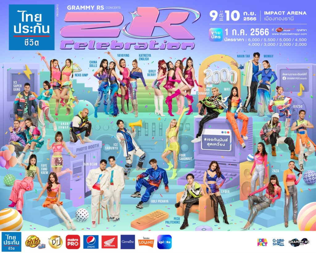 เตรียมตัวให้พร้อม!! ครั้งแรกของความมันส์ยุค 2000 ที่รวมศิลปินตัวตึงไว้บนเวทีเดียวกันมากที่สุด ซ้อมร้อง ซ้อมเต้น กันมาให้ดี บอกเลยว่างานนี้ จัดเต็ม!! พลาดแล้วจะเสียดาย “ไทยประกันชีวิต presents GRAMMY X RS : 2K Celebration Concert” จัดขึ้น 2 รอบการแสดงสด ในวันเสาร์ที่ 9 และ วันอาทิตย์ที่ 10 กันยายน 2566 ณ IMPACT ARENA เมืองทองธานี บัตรราคา : 6,000 / 5,500 / 5,000 / 4,500 / 4,000 / 3,000 / 2,500 / 2,000 เปิดจำหน่ายบัตร 1 กรกฎาคม 2566 เวลา 10.00 น เป็นต้นไปที่ไทยทิคเก็ตเมเจอร์ทุกสาขา และ http://www.thaiticketmajor.com หรือโทร 02-262-3456 และสามารถติดตามรายละเอียดเพิ่มเติมได้ที่ www.facebook.com/grammyrsconcerts