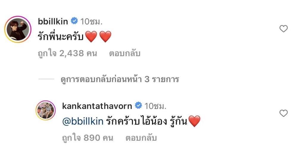 ซึ่งงานนี้บิวกิ้นได้รีบเข้ามาตอบคอมเมนต์ว่า”รักพี่นะครับ” ส่วนหนุ่มกันต์ก็ได้ตอบกลับว่า”รักคร้าบไอ้น้อง รู้กัน”