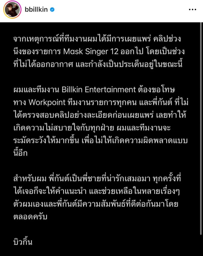 “จากเหตุการณ์ที่ทีมงานผมได้มีการเผยแพร่ คลิปช่วงนึงของรายการ Mark Singer 12 ออกไป โดยเป็นช่วงที่ไม่ได้ออกอากาศ และกำลังเป็นประเด็นอยู่ในขณะนี้ ผมและทีมงาน Billkin Entertainment ต้องขอโทษ ทาง Workpoint ทีมงานรายการทุกคน และ พี่กันต์ ที่ไม่ได้ตรวจสอบคลิปอย่างละเอียด ก่อนเผยแพร่ เลยทำให้เกิดความไม่สบายใจกับทุกฝ่าย ผมและทีมงานจะระมัดระวังให้มากขึ้นเพื่อไม่ให้เกิดความผิดพลาดแบบนี้อีก สำหรับผม พี่กันต์เป็นพี่ชายที่น่ารักเสมอมา ทุกครั้งที่ได้เจอก็จะให้คำแนะนำ และช่วยเหลือในหลายๆเรื่อง ตัวผมเองและพี่กันต์มีความสัมพันธ์ที่ดีต่อกันมาโดยตลอดครับ”