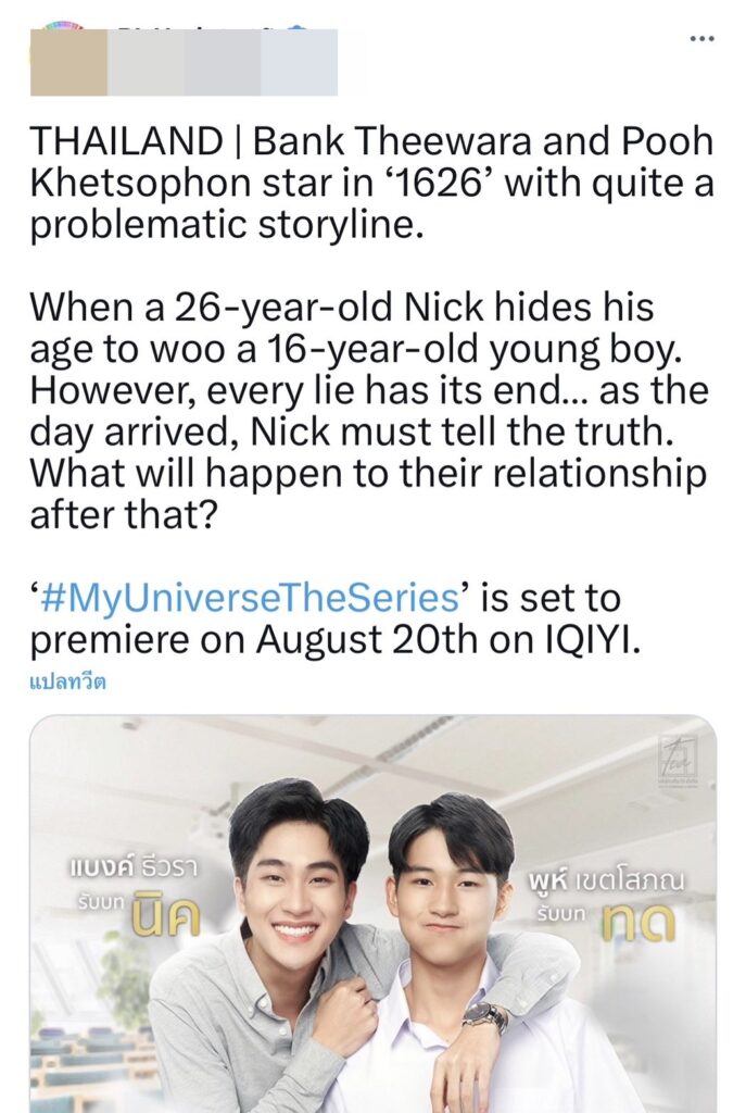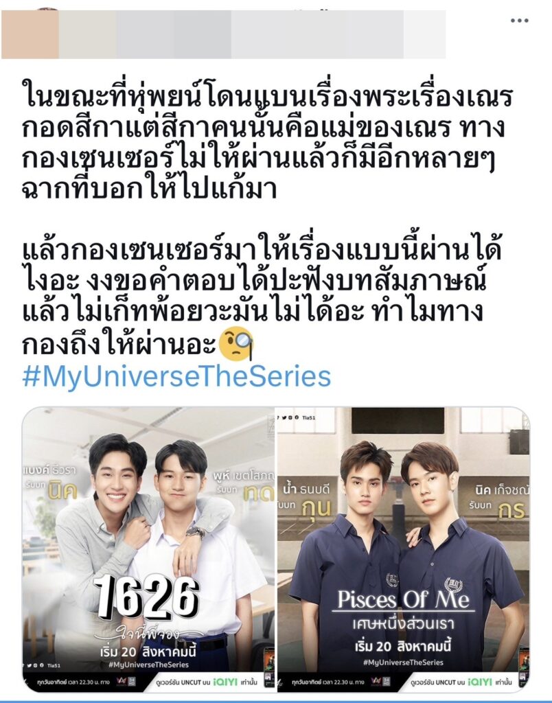 ร้อนแรงจนติดเทรนด์ทวิตเตอร์เลยทีเดียว สำหรับซีรีส์เรื่อง “เศษหนึ่งส่วนเรา” นำแสดงโดย นิค-เก็จชณัฐ สุวรรณบุตร และ น้ำ-ธนบดี วาธง กำกับโดย กิตติ์ บทศรี และเรื่อง “ใจนี้พี่จอง (1626)” นำแสดงโดย พูห์-เขตโสภณ โสภณมณี และ แบงค์ – ธีวรา ปัญญาธารา กำกับโดย ภาณุพงษ์ ไชโย ซึ่งเป็นหนึ่งในโปรเจคสุดยิ่งใหญ่แห่งปี กับ “My Universe The Series” ที่ล่าสุดกำลังตกเป็นประเด็นของสังคม เกี่ยวกับเรื่องเนื้อหาของซีรีส์ที่ไม่เหมาะสม โดยเฉพาะฉากเลิฟซีน ของคนอายุต่างวัย