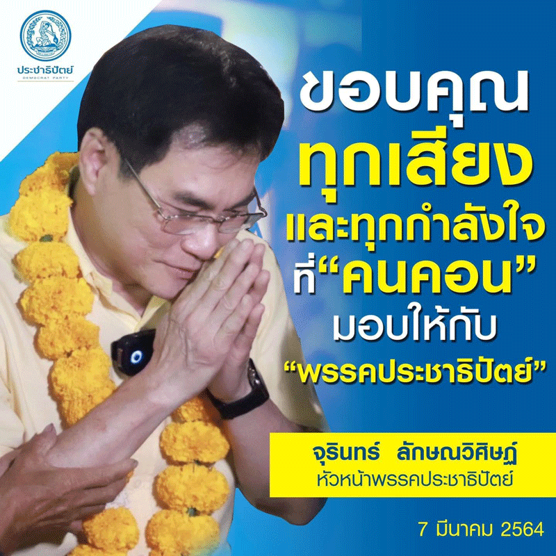 นายจุรินทร์ ลักษณวิศิษฏ์ รองนายกรัฐมนตรีและรัฐมนตรีว่าการกระทรวงกลาโหม ในฐานะหัวหน้าพรรคประชาธิปัตย์ (ปชป.) ขอบคุณทุกเสียงและทุกกำลังใจ ที่ชาวนครศรีธรรมราช เขต 3 มอบให้กับพรรคประชาธิปัตย์