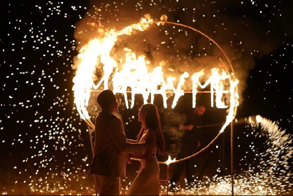 พร้อมการแสดงระบำหน้าท้องอันโด่งดัง ตามด้วยการแสดงโชว์กระบองไฟ เมื่อบรรยากาศเป็นใจแสงไฟคำว่า MARRY ME ก็ถูกจุดขึ้นกลางวงแหวนไฟขนาดใหญ่ พร้อมกับการคุกเข่าขอแต่งงานอย่างสุดเซอร์ไพรส์ของแอ็คมี่-DoubleDeep สร้างความตกใจและดีใจให้กับแฟนสาว นนนี่-ณัฐชาเป็นอย่างยิ่ง ก่อนที่แอ็คมี่-DoubleDeep จะสวมแหวนขอแต่งงาน เป็นแหวน Emerald Eternity ใช้เพชร Emerald จำนวน 18 เม็ด น้ำ 100-99 IF-VVS GIA ทุกเม็ด น้ำหนักรวม 5.66 กะรัต ตัวเรือน 18K White Gold ให้กับแฟนสาวและการชนแก้วแชมเปญที่สลักชื่อของทั้งสองเพื่อเฉลิมฉลองการขอแต่งงานในครั้งนี้ ในความรู้สึกส่วนตัวของว่าที่เจ้าสาว “รู้สึกตื่นเต้นมากไม่คิดว่าพี่แอ็คจะขอหนูแต่งงานที่นี่ เพราะไม่มีทีมงานของพี่แอ็คจากประเทศไทยตามมาด้วยเลย แต่ก็แอบรู้ตอนพี่แอ็คเน้นย้ำว่าดินเนอร์วันนี้ใส่สีขาวกันนะ แต่ก็ไม่แน่ใจ ก็ตื่นเต้นอยู่ดี”