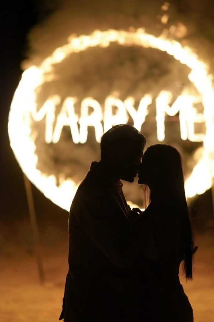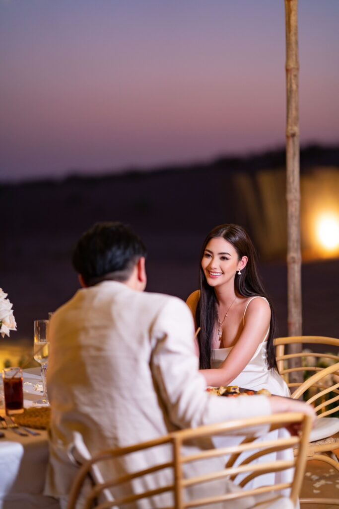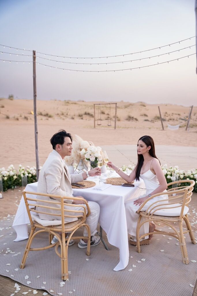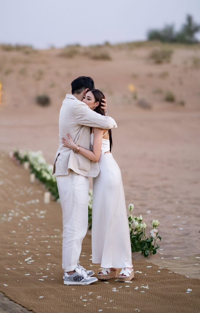 ขี่อูฐท่องทะเลทราย จนไปถึงสถานที่ขอแต่งงานที่จัดเตรียมไว้ว่าเป็นการดินเนอร์สุดพิเศษเท่านั้น ซึ่งทุกอย่างเป็นความลับอย่างแนบเนียน ด้วยการเนรมิตทะเลทรายอันเวิ้งว้างที่ดูไบให้เป็นสวรรค์บนดินด้วยงบประมาณกว่า 10 ล้านบาท เริ่มตั้งแต่การตกแต่งซุ้มประตูทางเข้าและบริเวณทางเดินที่เข้าไปยังสถานดินเนอร์ซึ่งประดับประดาด้วยกุหลาบสีขาว เป็นโต๊ะดินเนอร์มื้อค่ำอันหรูหราที่จัดเตรียมอาหารด้วยเชฟระดับมิชลินสตาร์ พร้อมคลอบรรยากาศชมพระอาทิตย์ตกดินในยามเย็นด้วยเสียงแซกโซโฟนจากศิลปินของดูไบอันแสนโรแมนติก
