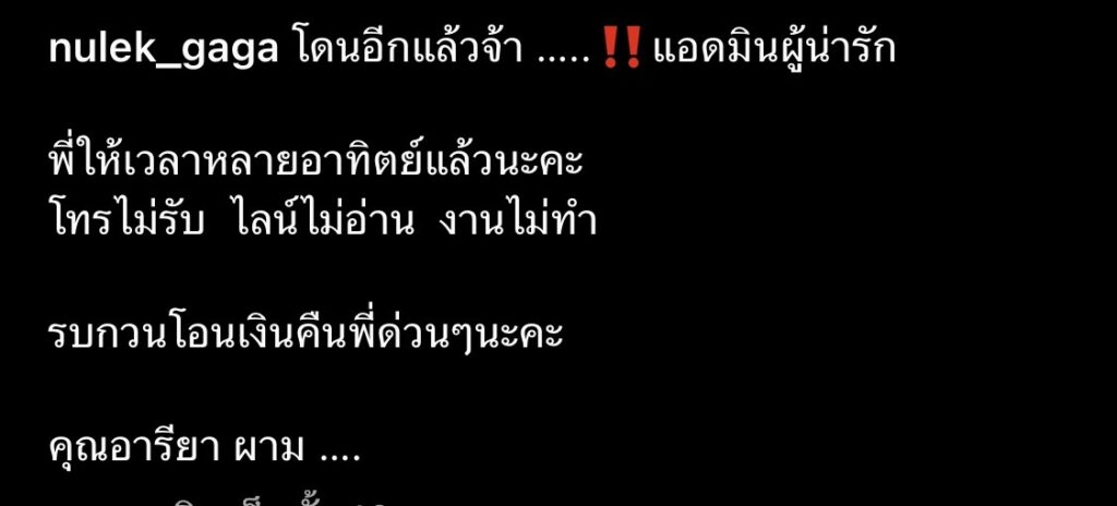 “โดนอีกแล้วจ้า !! แอดมินผู้น่ารัก พี่ให้เวลาหลายอาทิตย์แล้วนะคะ โทรไม่รับ ไลน์ไม่อ่าน งานไม่ทำ รบกวนโอนเงินคืนพี่ด่วนๆนะคะ คุณอารียา ผาม ….”