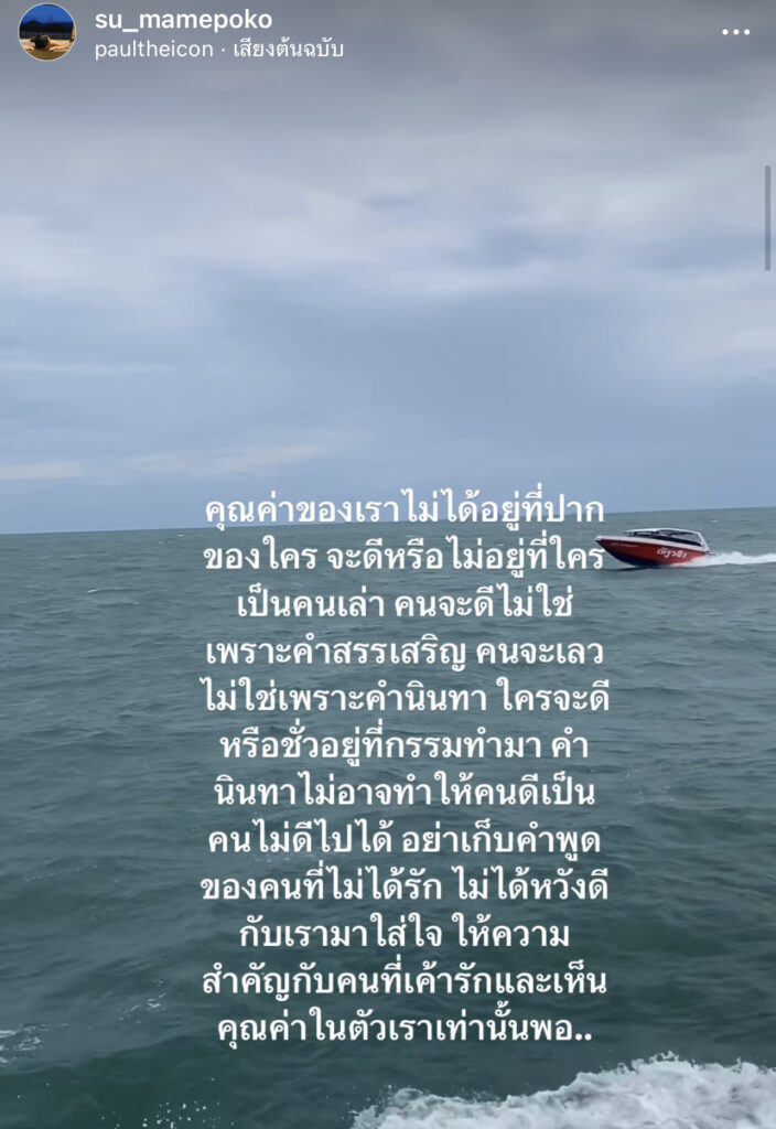 คุณค่าของเราไม่ได้อยู่ที่ปากของใคร จะดีหรือไม่อยู่ที่ใคร เป็นคนเล่า คนจะดีไม่ใช่เพราะคำสรรเสริญ คนจะเลวไม่ใช่เพราะคำนินทา ใครจะดีหรือชั่วอยู่ที่กรรมทำมา คำนินทาไม่อาจทำให้คนดีเป็นคนไม่ดีไปได้ อย่าเก็บคำพูดของคนที่ไม่ได้รัก ไม่ได้หวังดี กับเรามมาใส่ใจ ให้ความสำคัญกับคนที่เค้ารักและเห็นคุณค่าในตัวเราเท่านั้นพอ พร้อมแคปชั่นว่าบอกว่า ใครเขาจะด่าจะนินทาว่าร้ายเราอย่างไรเราปล่อยผ่าน เพราะคนเหล่านั้นเค้าไม่ได้รู้จักเราดีพอ ทำหน้าที่ของเราต่อไป ให้กาลเวลาทำหน้าที่ของมัน