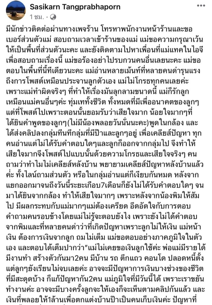 ล่าสุดทางด้านคุณแม่สาวพิม ได้ออกมาเคลื่อนไหวชี้แจงร่ายยาวถึงปมดังกล่าว โดยการโพสต์ข้อความว่า “มีนักข่าวติดต่อผ่านทางเพจร้าน โทรหาพนักงานหน้าร้านและขอเบอร์ส่วนตัวแม่ สอบถามเวลาเข้าร้านของแม่ แม่ขอความกรุณาเว้นให้เป็นพื้นที่ส่วนตัวนะคะ และยังติดตามไปหาเพื่อนที่แม่แทคในไอจีเพื่อสอบถามเรื่องนี้ แม่ขอร้องอย่าไปรบกวนคนอื่นเลยนะคะ แม่ขอตอบในพื้นที่นี้ทีเดียวนะคะ แม่อ่านหลายเม้นท์ที่หลายคนด่ารุนแรงถึงการโพสต์เหมือนประจานลูกตัวเอง แม่ไม่โกรธทุกคนเลยค่ะ เพราะแม่ทำผิดจริงๆ ที่ทำให้เรื่องมันลุกลามขนาดนี้ แม่ก็รักลูกเหมือนแม่คนอื่นๆค่ะ ทุ่มเททั้งชีวิต ทั้งหมดที่มีเพื่ออนาคตของลูกๆ แต่ที่โพสต์ไปเพราะตอนนั้นยอมรับว่าเสียใจมาก น้อยใจมากๆที่ได้ยินคำพูดของลูกๆ(ไม่มีน้องพลอยวันนั่นนะคะ)พูดในกล้อง และได้ส่งคลิปลงกลุ่มทีนทีกลุ่มที่มีป๊าและลูกๆอยู่ เพื่อเคลียส์ปัญหา ทุกคนอ่านแต่ไม่ได้รับคำตอบใดๆและลูกก็ออกจากกลุ่มไป จึงทำให้เสียใจมากจึงโพสต์ไปแบบนั้นด้วยความโกรธและเสียใจจริงๆ คนถามว่าทำไมไม่เคลียส์หลังบ้าน พยายามเคลียส์ปัญหาหลังบ้านแล้วค่่ะ ทั้งไลน์ถามส่วนตัว หรือในกลุ่มอ่านแต่ก็เงียบกันหมด หลังจากแยกออกมาจนถึงวันนี้ระยะเกือบ7เดือนก็ยังไม่ได้รับคำตอบใดๆ จนมาได้ยินจากกล้อง ทำให้เสียใจมากๆ เพราะหลังจากน้องพิมให้สัมไป มีผลกระทบกับแม่มากๆแม่ต้องเครียด อึดอัดใจกับการตอบคำถามคนรอบข้างโดยแม่ไม่รู้จะตอบยังไง เพราะยังไม่ได้คำตอบจากพิมและที่หลายคนด่าว่าที่เกิดปัญหาเพราะลูกไม่ให้เงิน แม่หน้าเงิน ต้องการเงินจากลูก ถมไม่เต็ม แม่ขอตอบอย่างภาคภูมิใจในตัวเอง และตอบได้เต็มปากว่า”แม่ไม่เคยขอเงินลูกใช้ค่ะ พ่อแม่มีรายได้ มีงานทำ สร้างตัวกันมา2คน มีบ้าน รถ ตึกแถว คอนโด ปลอดหนี้ตั้งแต่ลูกๆยังเรียนไม่จบเลยค่ะ อาจจะมีปัญหาการเงินบางช่วงของชีวิตที่มีสะดุดบ้าง ก็แก้ปัญหากัน2คน แม่ภูมิใจที่มีวันนี้ได้ เพราะเราขยันทำงานค่ะ อาจจะมีบางครั้งลูกจะให้เองก็จะเห็นตามคลิปกันแล้ว และเงินที่พลอยให้1ล้านเพื่อตกแต่งบ้านป๊าเป็นคนเก็บเงินค่ะ ปัญหาที่เกิดขึ้นไม่เกี่ยวกับเรื่องเงินเลยค่ะ มันเป็นความไม่เข้าใจกันในครอบครัวที่สะสมมานานจนรุนแรงขึ้นเรื่อยๆพยายามคุย จะเคลียส์ปัญหานี้กับทุกคนแต่ไม่ได้รับคำตอบใดๆ เรื่องที่มีคนบอกว่าแม่ขายของตลาดนัด แต่ลูกกินอาหารแพงๆอย่าไปโยงเลยค่ะ ก็เป็นเพราะแม่ชอบขายของเอง เพราะอยากมีรายได้หลายๆทางค่ะ ลูกจะใช้ชีวิตแบบใหนก็เป็นสิทธิ์ของเค้า เค้าหา