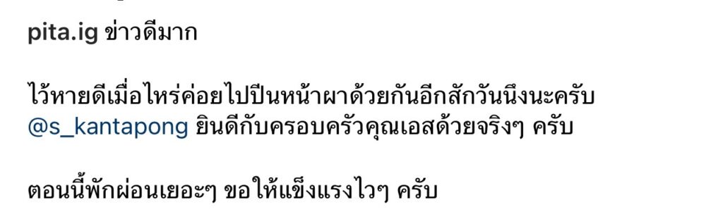 เช่นเดียวว่าที่นายกฯ คนใหม่ของเมืองไทย “ทิม พิธา ลิ้มเจริญรัตน์” ก็ได้โพสต์ภาพคู่ “เอส กันตพงศ์”พร้อมแคปชั่นว่า “ข่าวดีมาก ไว้หายดีเมื่อไหร่ค่อยไปปีนหน้าผาด้วยกันอีกสักวันนึงนะครับ @s_kantapong ยินดีกับครอบครัวคุณเอสด้วยจริงๆ ครับ ตอนนี้พักผ่อนเยอะๆ ขอให้แข็งแรงไวๆ ครับ”
