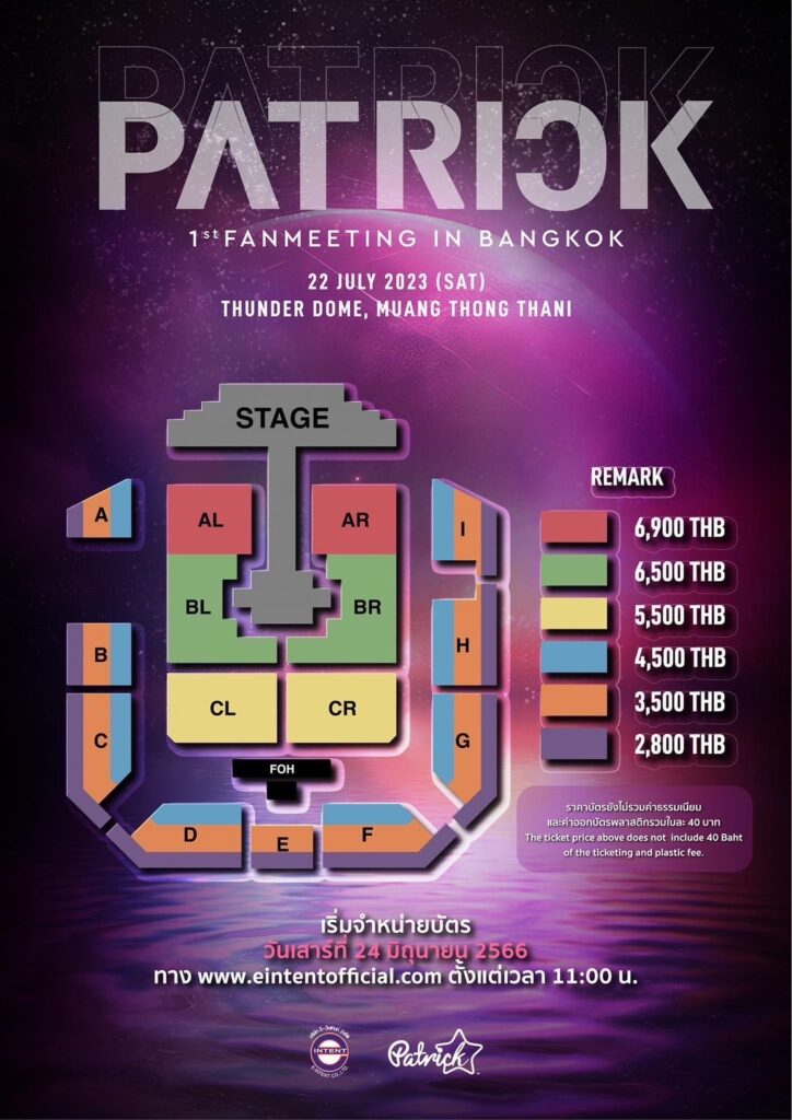 โดยล่าสุดได้มีการเผยรายละเอียดเกี่ยวกับงาน PATRICK 1st Fan Meeting in Thailand ครั้งนี้ว่าจะจัดขึ้นในวันเสาร์ที่ 22 กรกฎาคม นี้ ที่ ธันเดอร์โดม เมืองทองธานี ซึ่งจะเปิดขายบัตรวันนี้ (24 มิถุนายน 66) เวลา 11.00 น. ทาง www.eintentofficial.com