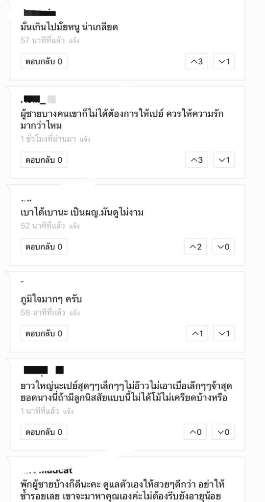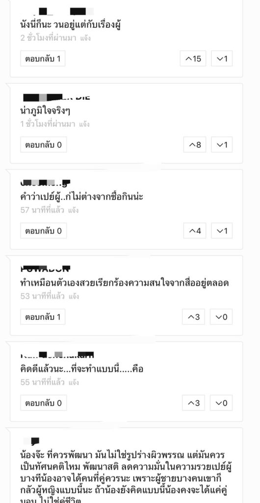 งานนี้ทำเอาชาวเน็ตที่เห็นด้วยและไม่เห็นด้วยเข้ามาคอมเมนต์กระจาย ทางด้านคอมเมนต์ชมมองว่า เป็นผู้หญิงสวย แซ่บรวยมาก ส่วนคอมเมนต์ที่ไม่เห็นด้วยเข้ามาแซะแรงว่า คำว่าเปย์ผู้ ไม่ต่างจากซื้อกินนะ , ทำเหมือนตัวเองสวย,มั่นเกินไปไหมหนูมันน่าเกลียด ,เบาได้เบานะ เป็นผู้หญิงมันดูไม่งาม และอีกมากมาย